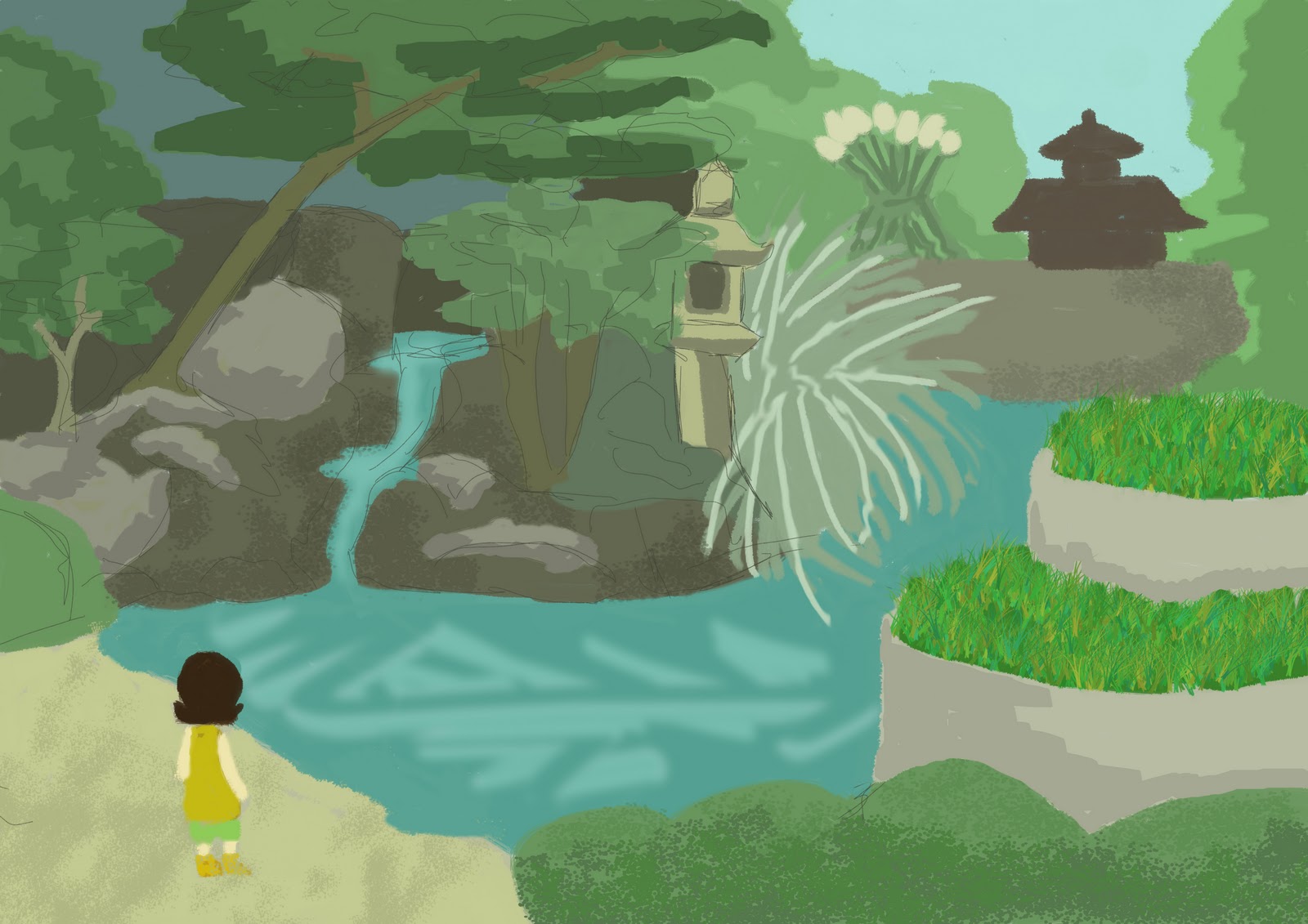 Also in the early stages I planned for a chase through a small maze of streets. This involved passing through a giant red Japanese gate, which I found a photo of in reference photographs a family member took on their trip in Japan. The chase has now been moved to an outside area that slowly gets more colourful as time progresses. This takes place along an overgrown path which Bea playfully uses as stepping stones. I also tried to get a sense of scale into the shot, much in the same way Studio Ghibli do with their environments.