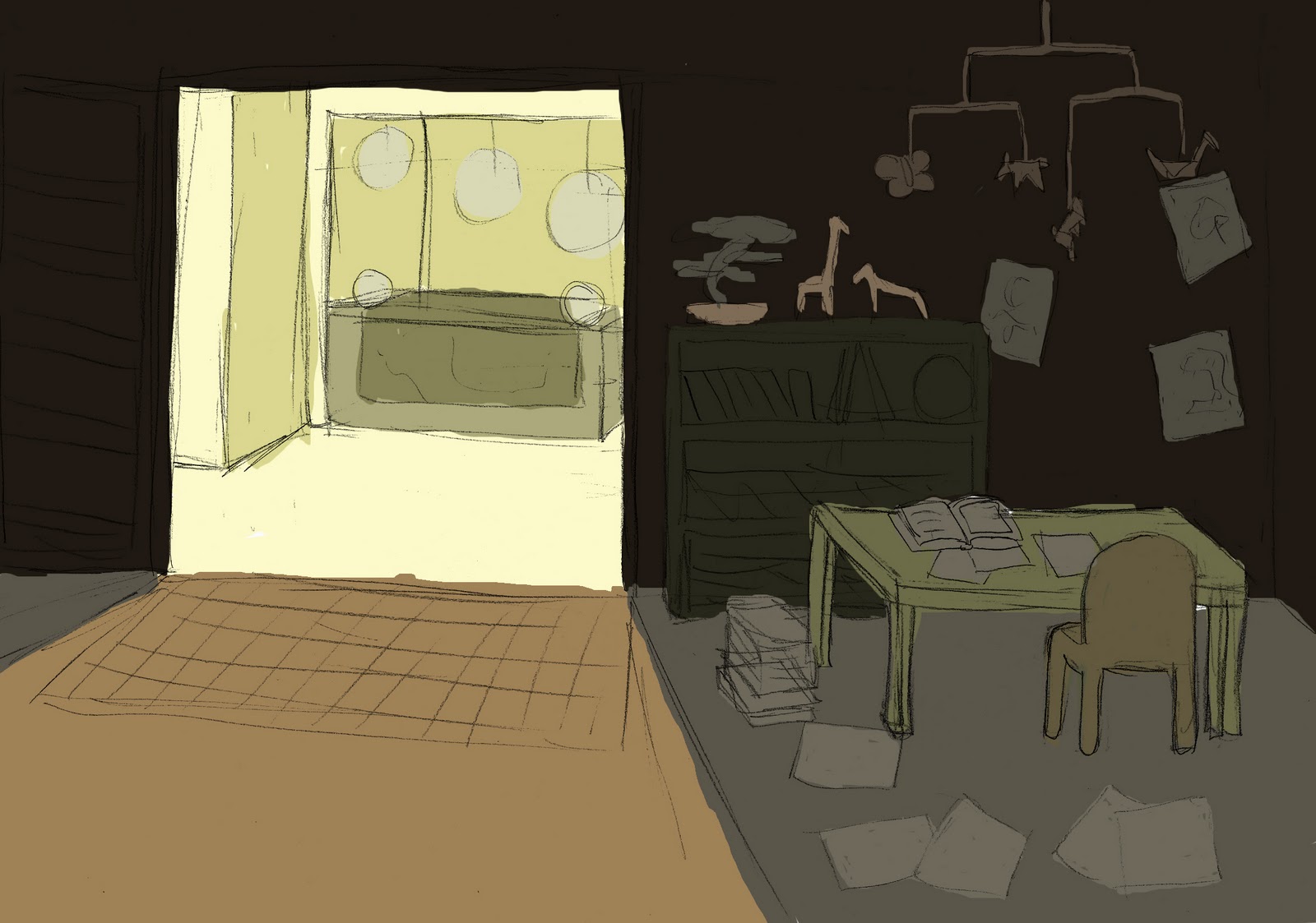 In the beginning of production Bea started in her dull grey room, trying to make origami. The paper plane she threw out of frustration then lead her out into the world. This has changed a little bit now in the Animatic, and I've tried to minimise the amount of time she spends in her room at the beginning. I have also cut out the part of the story where she was making Origami because it complicated the story and meant a great deal more animation would be involved.